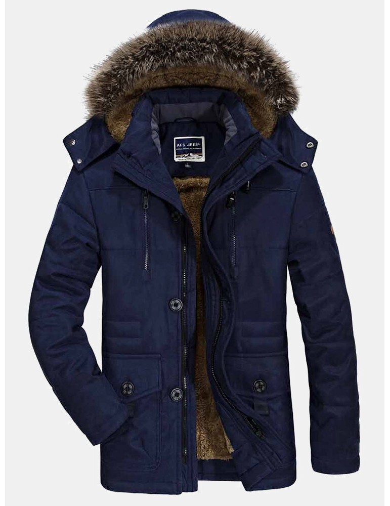 Mens Fleece Lined Multi Pocket Faux Fur Collar Detachable Hooded Coat